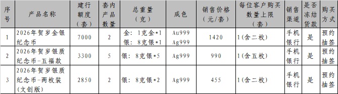 1.应有关要求,本次贵金属纪念币面向实名客户销售,2026年贺岁金银纪念币采用“预约抽签”方式确定可购买的客户。本产品对应的每位客户购买数量上限等请见本公告第一条中“具体产品信息”内容。