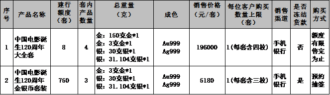 我行本次销售的产品,一是中国电影诞生120周年大全套,其中包含中国电影诞生120周年150克金币、3克金币、30克银币各一枚和2025版中国龙银质纪念币(中国电影诞生120周年纪念版)一枚;二是中国电影诞生120周年金银币套装,其中包含中国电影诞生120周年3克金币、30克银币各一枚和2025版中国龙银质纪念币(中国电影诞生120周年纪念版)一枚。具体产品信息如下: