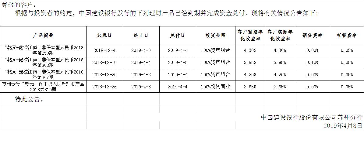 中国建设银行理财产品终止及清算公告