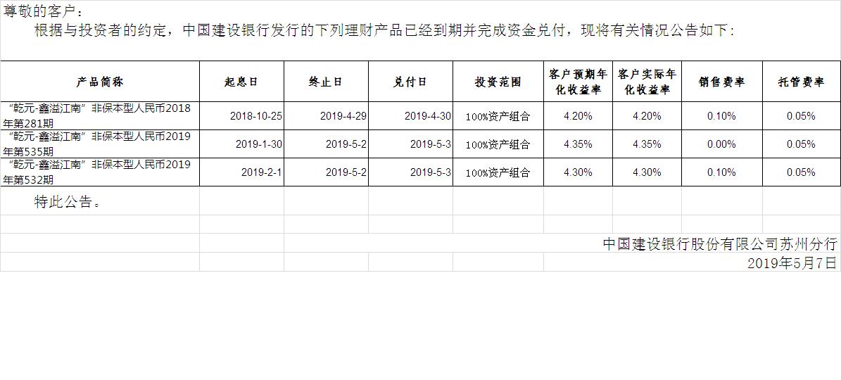 中国建设银行理财产品终止及清算公告