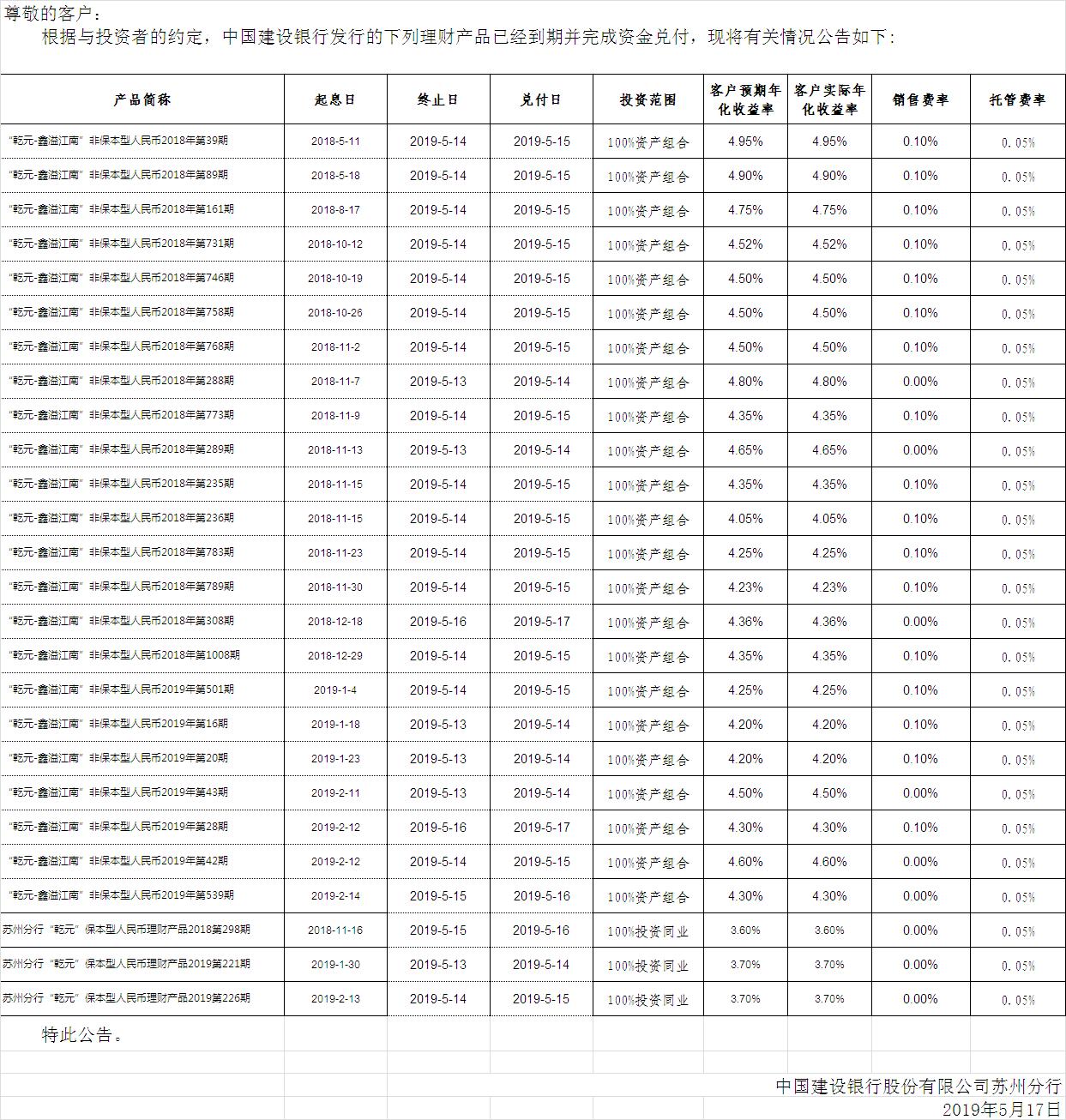 中国建设银行理财产品终止及清算公告